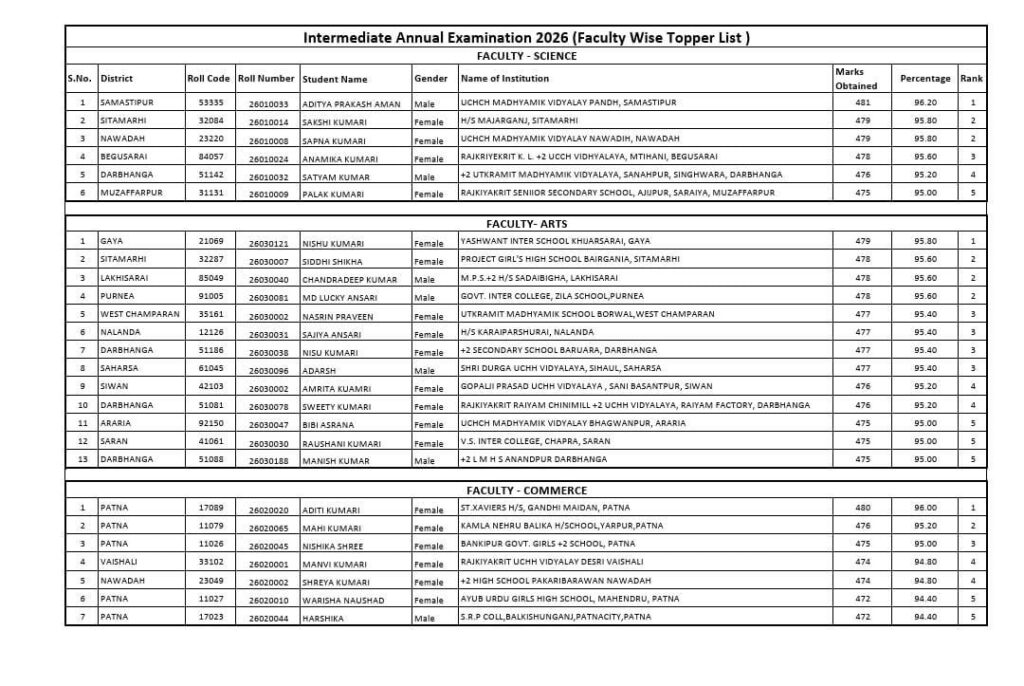 इस बार टॉपर्स की सूची में बेटियों का दबदबा साफ नजर आया है। तीनों संकाय—आर्ट्स, कॉमर्स और साइंस—को मिलाकर कुल 26 टॉपर्स में 19 छात्राएं शामिल हैं, जबकि केवल 7 छात्र ही जगह बना सके। आर्ट्स संकाय में गया की निशु कुमारी ने प्रथम स्थान प्राप्त किया, वहीं कॉमर्स में पटना की अदिति कुमारी टॉपर रहीं। साइंस स्ट्रीम में समस्तीपुर के आदित्य प्रकाश ने राज्य में पहला स्थान हासिल किया।