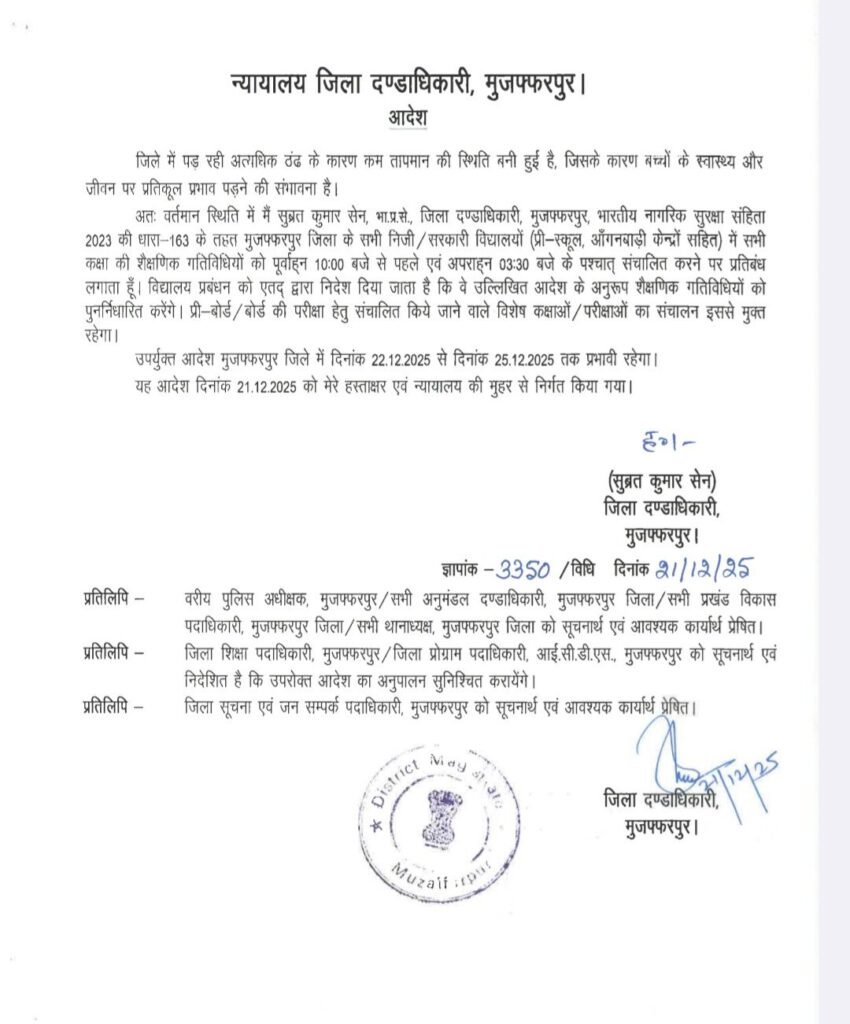 जारी आदेश के अनुसार अब मुजफ्फरपुर जिले के सभी विद्यालयों में शैक्षणिक गतिविधियां सुबह 10:00 बजे से पहले तथा दोपहर 03:30 बजे के बाद संचालित नहीं की जाएंगी। यह आदेश बच्चों को अत्यधिक ठंड के दुष्प्रभाव से बचाने के उद्देश्य से लागू किया गया है।