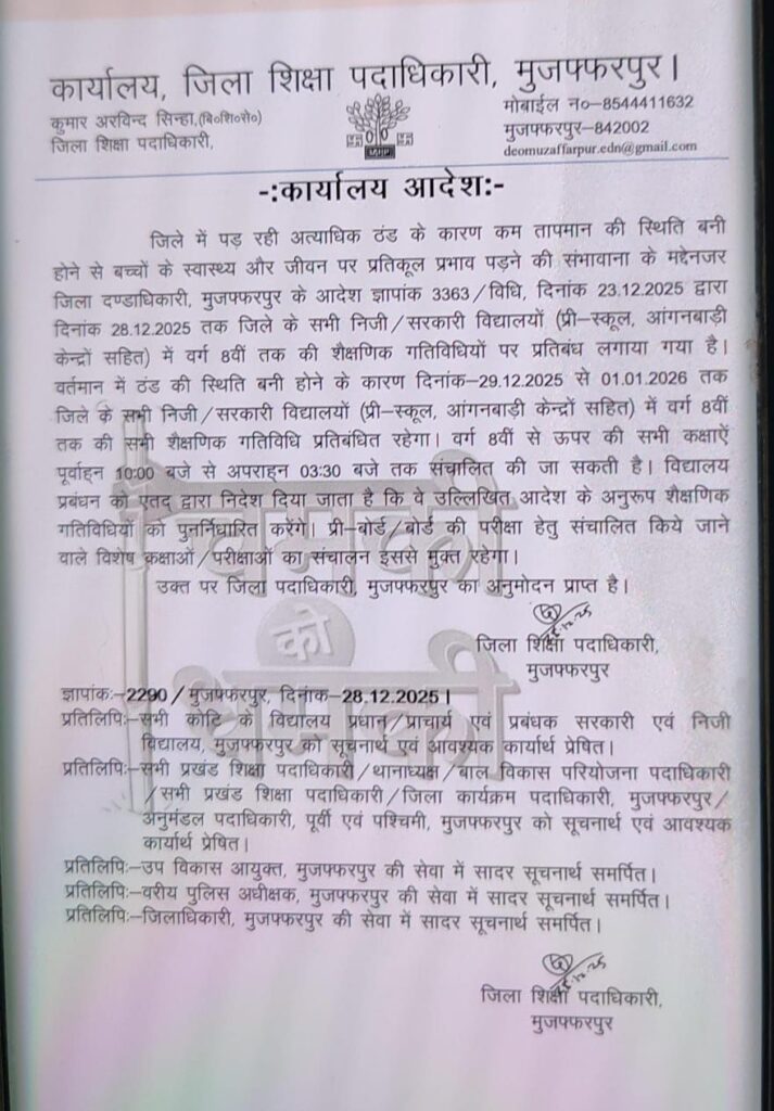मुजफ्फरपुर जिले में लगातार पड़ रही अत्यधिक ठंड और गिरते तापमान को देखते हुए जिला प्रशासन ने बड़ा फैसला लिया है। बच्चों के स्वास्थ्य और जीवन पर प्रतिकूल प्रभाव की आशंका को ध्यान में रखते हुए जिला शिक्षा पदाधिकारी, मुजफ्फरपुर ने जिले के सभी सरकारी और निजी विद्यालयों (प्री-स्कूल एवं आंगनबाड़ी केंद्र सहित) में कक्षा 8वीं तक की सभी शैक्षणिक गतिविधियों पर 1 जनवरी 2026 तक पूर्ण प्रतिबंध लगा दिया है।